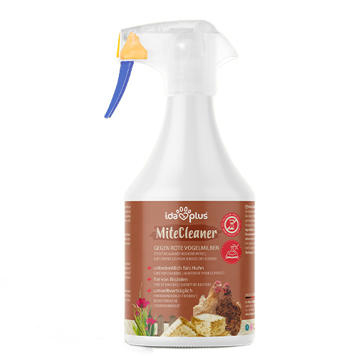 Anvendelse: Rengør altid hønsehuset grundigt og fjern eventuelt snavs. Sprøjt grundigt alle hjørner, kroge, kanter, siddepladser, reder, siddebrædder og andre mulige skjulesteder for mider med MiteCleaner. Dette kan med fordel gøres efter hver grundig rengøring af hønsehuset. Ryst godt før brug.